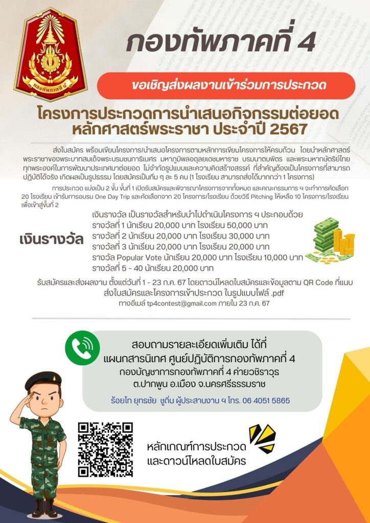 กองทัพบก โดย กองทัพภาคที่ 4 ขอเชิญเยาวชน/นักเรียนที่กำลังศึกษา มัธยมศึกษาปีที่ 3 – 6 ในพื้นที่ภาคใต้ ส่งผลงานเข้าร่วมการประกวด “โครงการประกวดการนำเสนอกิจกรรมต่อยอด หลักศาสตร์พระราชา” ชิงเงินรางวัลรวมกว่า 8 แสนบาท เพื่อสืบสานหลักศาสตร์พระราชา ส่งเสริมความรักถิ่นฐาน รักประเทศ และรักการปกครองระบอบประชาธิปไตยอันมีพระมหากษัตริย์ทรงเป็นประมุข โดยการสมัครเป็นทีม ๆ ละ 5 คน และเขียนโครงการเกี่ยวกับการต่อยอดหลักศาสตร์พระราชาส่งเข้าประกวด รับสมัครตั้งแต่บัดนี้ – 23 กรกฎาคม 2567 สอบถามรายละเอียดเพิ่มเติมที่ ศูนย์ประชาสัมพันธ์ กองทัพภาคที่ 4 โทร 0640515865