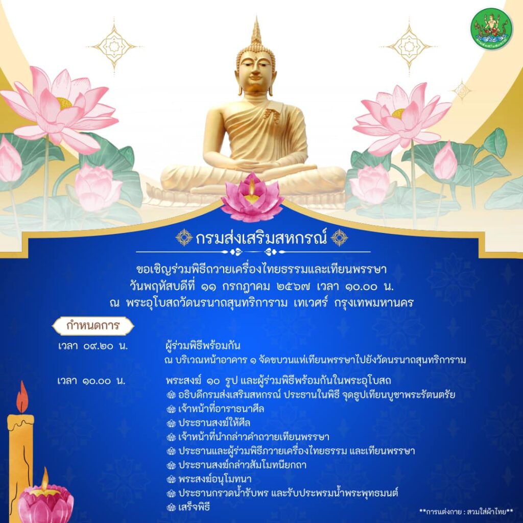 กรมส่งเสริมสหกรณ์ ขอเชิญร่วมพิธีถวายเครื่องไทยธรรมและเทียนพรรษา ในวันที่ 11 กรกฎาคม 2567