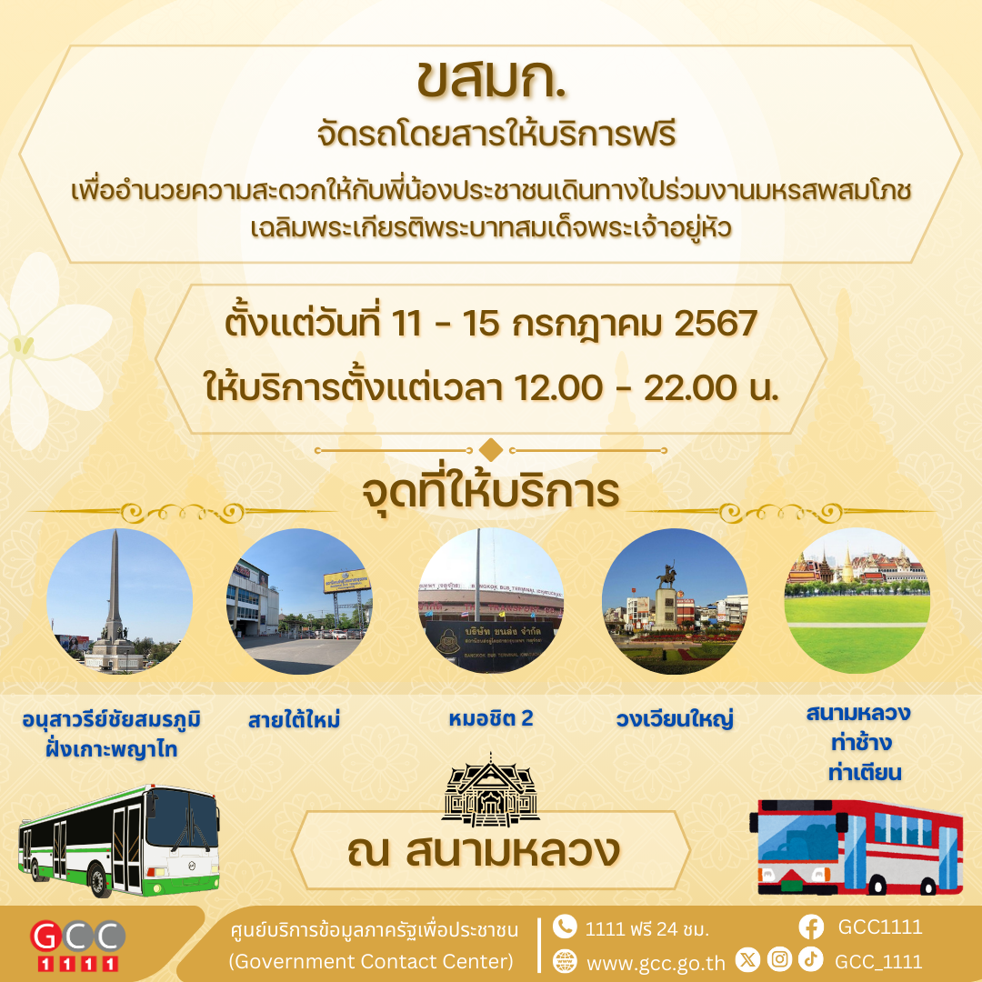 องค์การขนส่งมวลชนกรุงเทพ ได้จัดเตรียมรถโดยสารฟรี (จอดรับ – ส่งทุกป้าย) เพื่ออำนวยความสะดวกให้กับพี่น้องประชาชนเดินทางไปร่วมงานมหรสพสมโภชเฉลิมพระเกียรติพระบาทสมเด็จพระเจ้าอยู่หัว ระหว่างวันที่ 11 – 15 กรกฎาคม 2567 ให้บริการตั้งแต่เวลา 12.00 – 22.00 น.