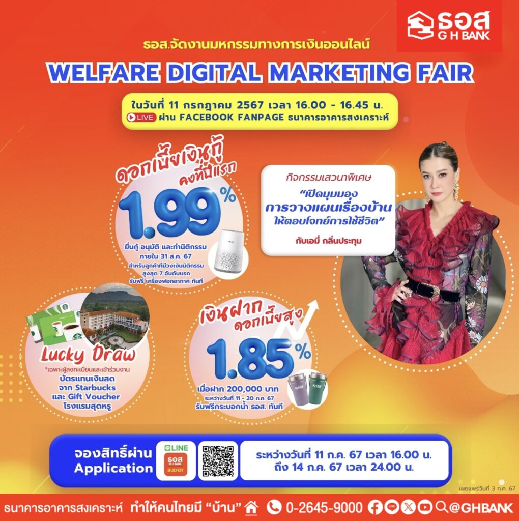 ธอส. จัดงานมหกรรมทางการเงินออนไลน์ Welfare Digital Marketing Fair วันที่ 11 กรกฎาคม 2567