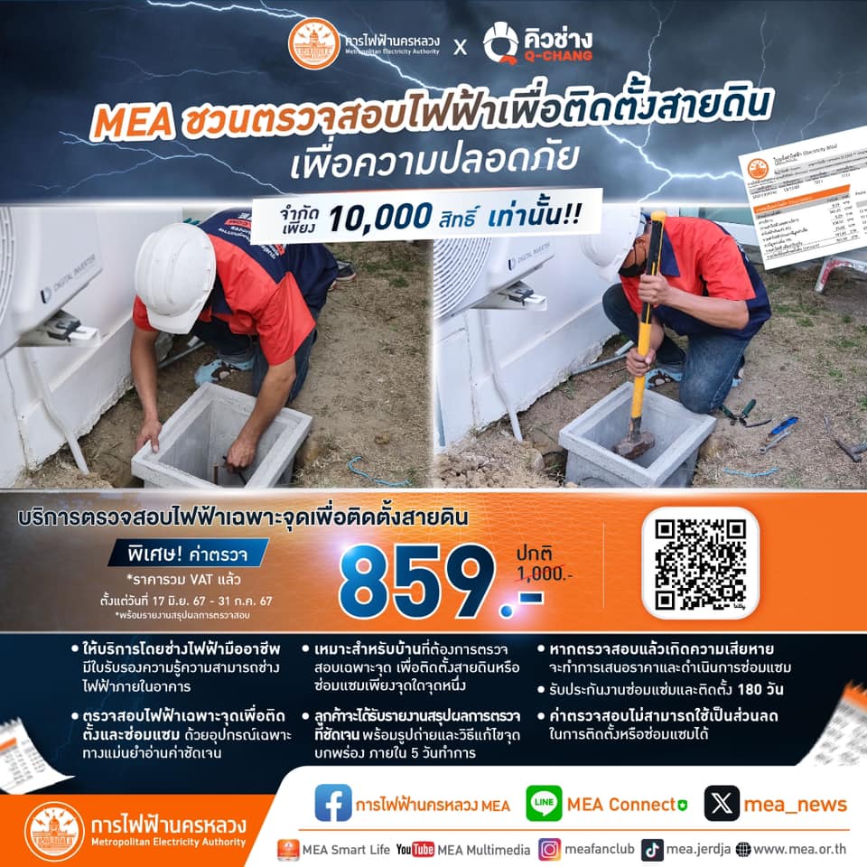 การไฟฟ้านครหลวง แนะนำผู้ใช้ไฟฟ้า MEA ที่อยู่ในจังหวัดกรุงเทพมหานคร นนทบุรี และสมุทรปราการ รับโค้ดส่วนลดการตรวจสอบระบบไฟฟ้าเฉพาะจุดเพื่อติดตั้งสายดินได้ที่ https://bit.ly/meaxqg (โค้ดส่วนลดใช้ได้เฉพาะกับลิงก์ที่มาจากหน้าเว็บของ MEA หรือ MEA Smart Life Application เท่านั้น) ตั้งแต่วันที่ 17 มิถุนายน ถึง 31 กรกฎาคม 2567