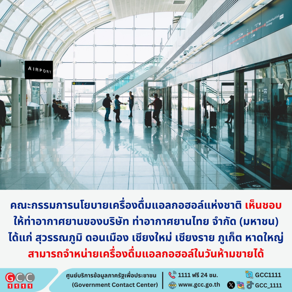 คณะกรรมการนโยบายเครื่องดื่มแอลกอฮอล์แห่งชาติ เห็นชอบให้ท่าอากาศยาน ของบริษัท ท่าอากาศยานไทย จำกัด (มหาชน) ได้แก่ สุวรรณภูมิ ดอนเมือง เชียงใหม่ เชียงราย ภูเก็ต หาดใหญ่ สามารถขายเครื่องดื่มแอลกอฮอล์ในวันห้ามขายได้