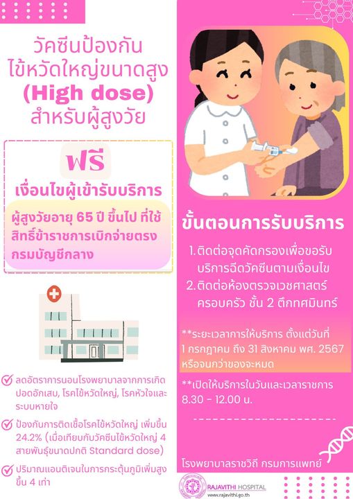 โรงพยาบาลราชวิถี เปิดให้บริการ “ฉีดวัคซีนป้องกันไข้หวัดใหญ่ขนาดสูง (High dose) สำหรับผู้สูงวัย” ฟรี สำหรับผู้ที่มีอายุ 65 ปีขึ้นไป ที่ใช้สิทธิ์ข้าราชการเบิกจ่ายตรงกรมบัญชีกลาง