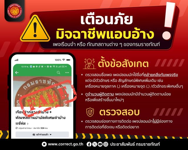 กรมราชทัณฑ์ เตือนภัยมิจฉาชีพแอบอ้างเพจเรือนจำ/ทัณฑสถานต่าง ๆ ของกรมราชทัณฑ์
