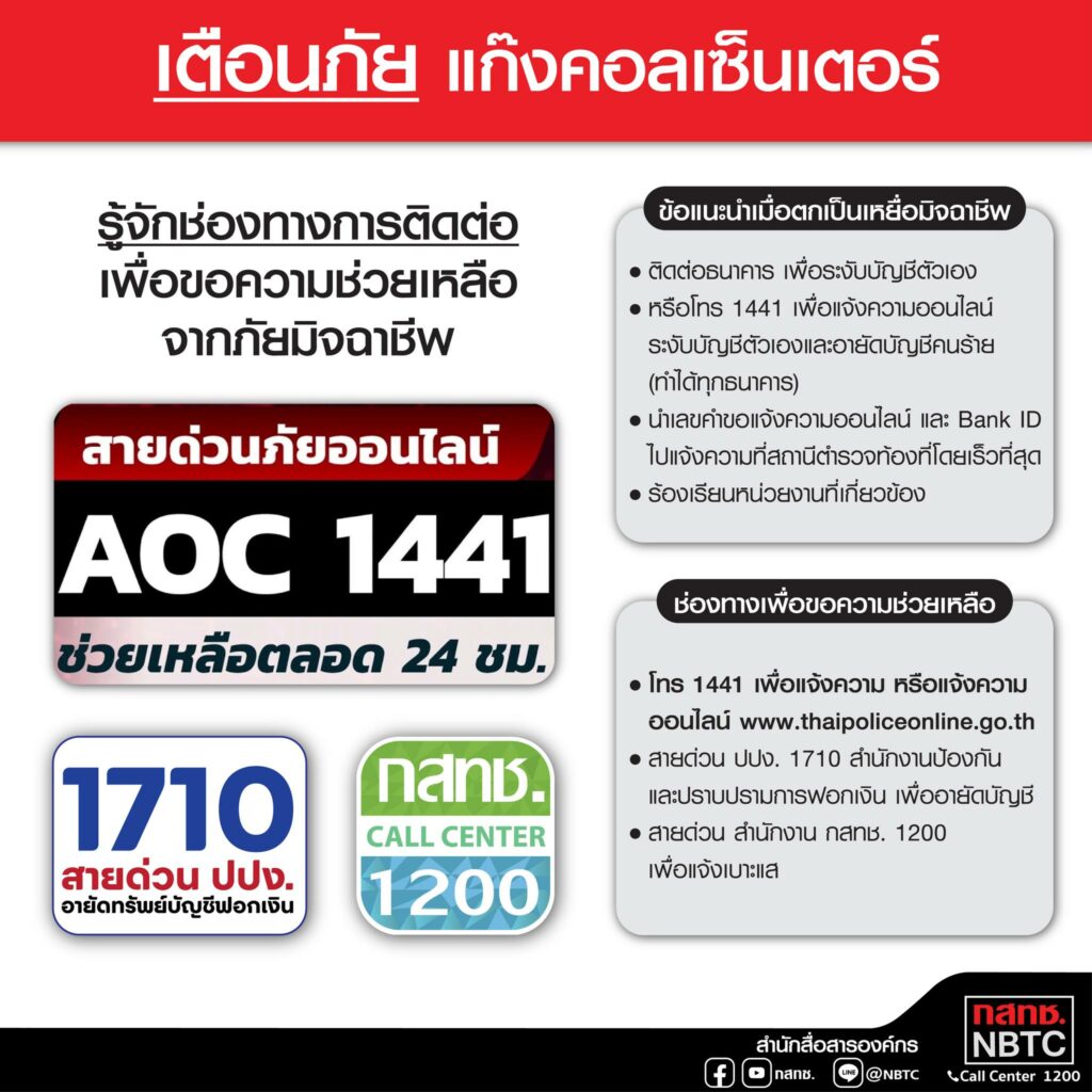- สายด่วน สำนักงาน กสทช. 1200: แจ้งเบาะแสเบอร์โทรศัพท์มิจฉาชีพ