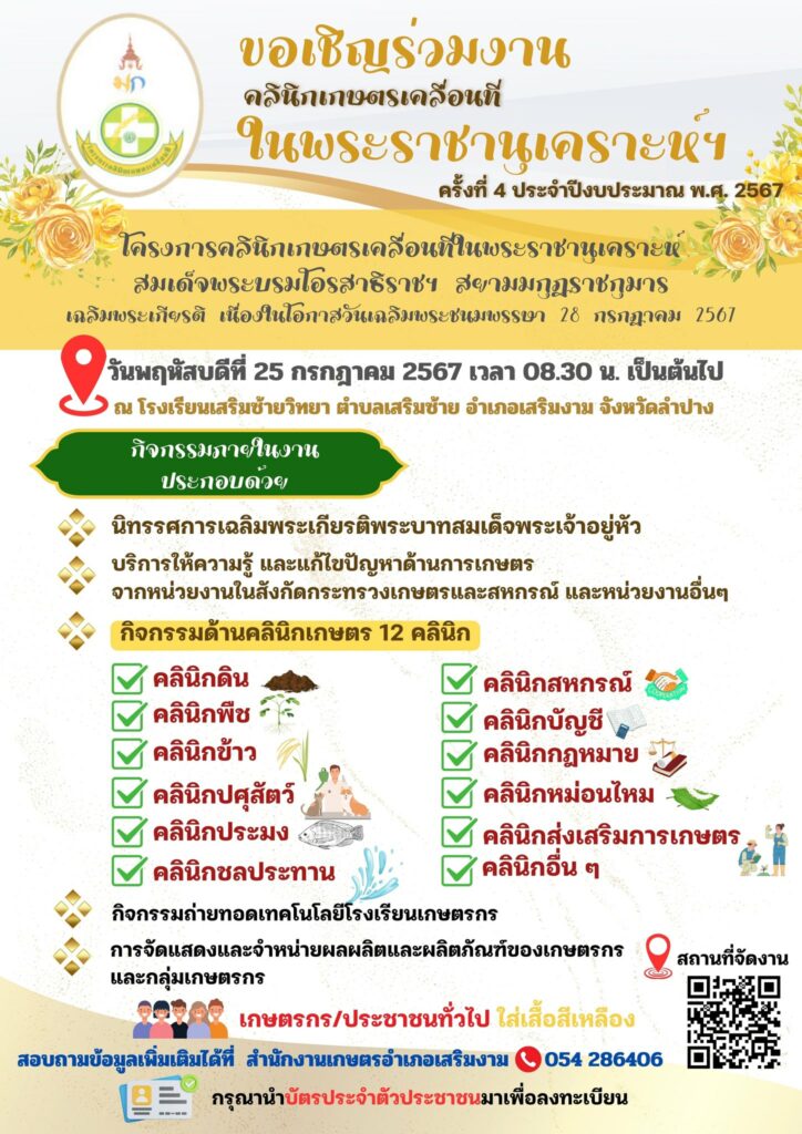 กรมส่งเสริมการเกษตร เชิญร่วมงานคลินิกเกษตรเคลื่อนที่ในพระราชานุเคราะห์ฯ วันที่ 25 กรกฎาคม 2567