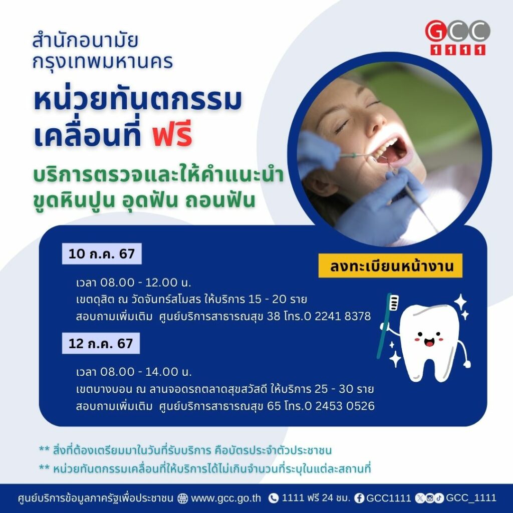 สำนักอนามัย กรุงเทพมหานคร จัดหน่วยทันตกรรมเคลื่อนที่ ฟรี วันที่ 10 และ 12 กรกฏาคม 2567