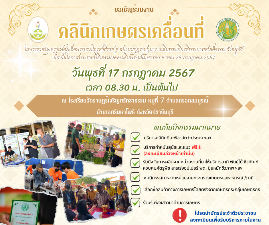 กรมส่งเสริมการเกษตร โดย สำนักงานเกษตรจังหวัดปราจีนบุรี เชิญร่วมงานคลินิกเกษตรเคลื่อนที่ ในพระราชานุเคราะห์สมเด็จพระบรมโอรสาธิราชฯ สยามมกุฎราชกุมาร เพื่อเฉลิมพระเกียรติพระบาทสมเด็จพระเจ้าอยู่หัว เนื่องในโอกาสพระราชพิธีมหามงคลเฉลิมพระชนมพรรษา 6 รอบ 28 กรกฎาคม 2567 วันที่ 17 กรกฎาคม 2567 เวลา 08.30 น. เป็นต้นไป ณ โรงเรียนวัดราษฎร์เจริญศรัทธาธรรม ม.7 ต.กรอกสมบูรณ์ อ.ศรีมหาโพธิ จังหวัดปราจีนบุรี
