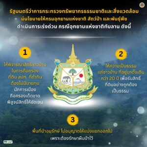กระทรวงทรัพยากรธรรมชาติและสิ่งแวดล้อม มีนโยบายให้กรมอุทยานแห่งชาติ สัตว์ป่า และพันธุ์พืช ดำเนินการเร่งด่วน กรณีอุทยานแห่งชาติทับลาน