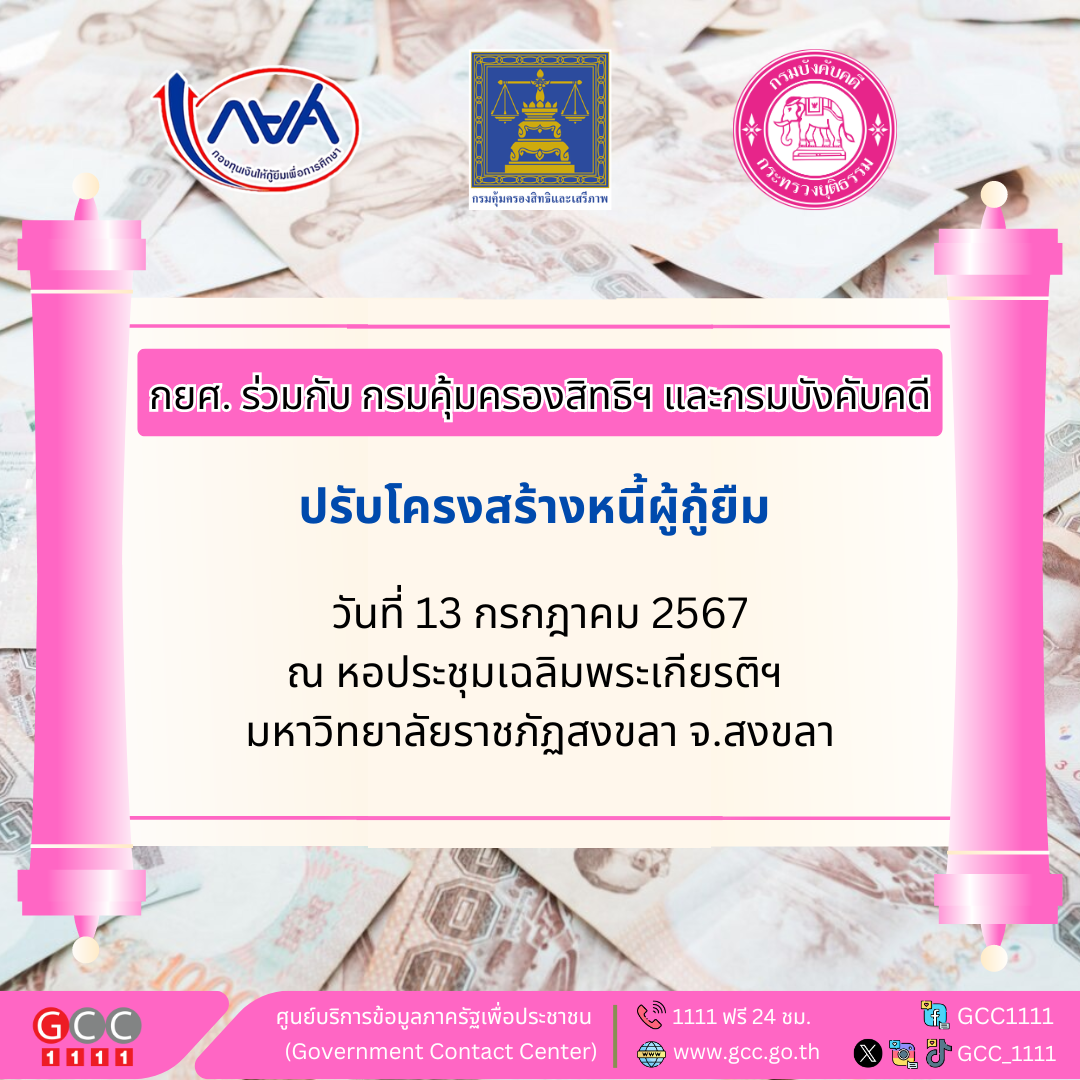กยศ. ลงพื้นที่ร่วมกับกรมคุ้มครองสิทธิและเสรีภาพและกรมบังคับคดี ปรับโครงสร้างหนี้ผู้กู้ยืม ในงาน “มหกรรมแก้หนี้ สร้างวิถีแห่งความเป็นธรรม” ณ หอประชุมเฉลิมพระเกียรติฯ มหาวิทยาลัยราชภัฏสงขลา จ.สงขลา วันที่ 13 ก.ค. 67 นี้