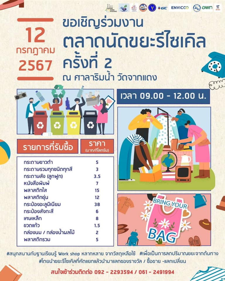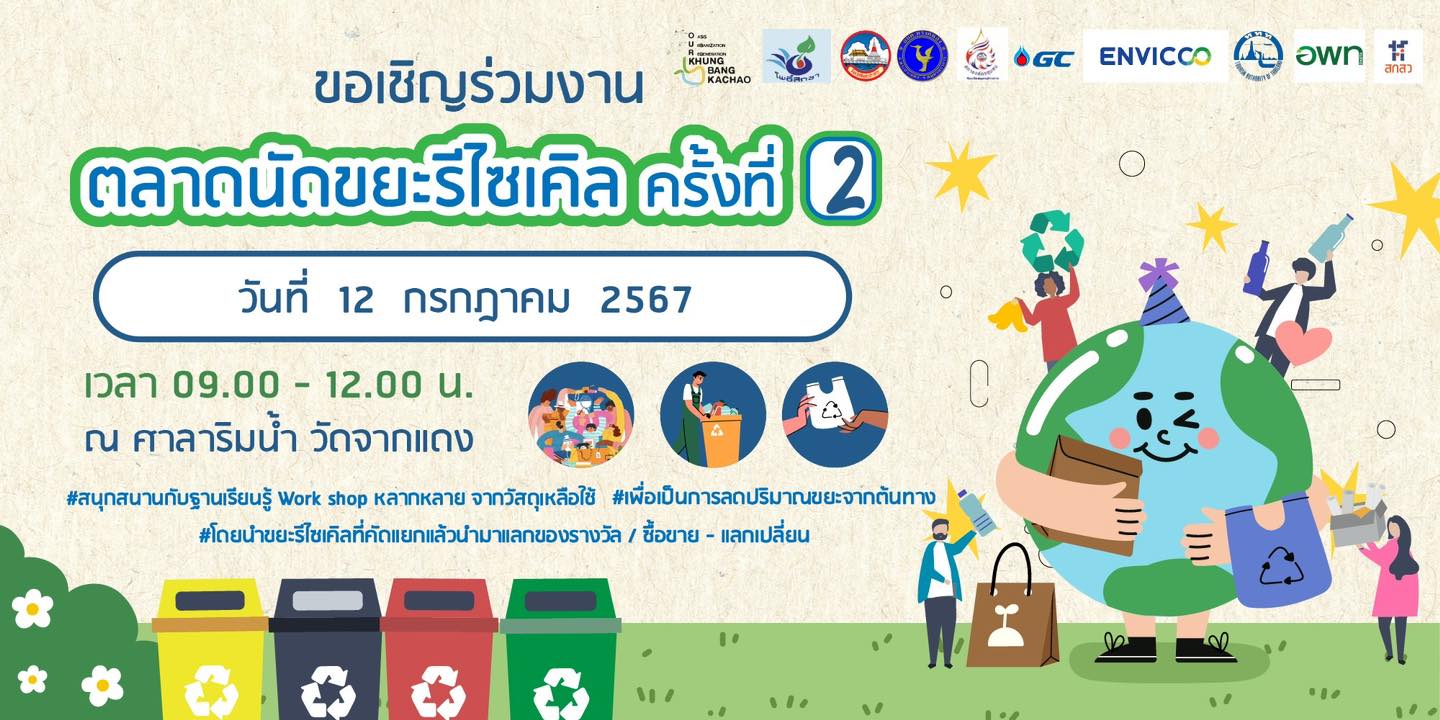 การท่องเที่ยวแห่งประเทศไทย ขอเชิญร่วมงาน ตลาดนัดรีไซเคิล ครั้งที่ 2 ในวันที่ 12 กรกฎาคม 2567 ตั้งแต่เวลา 09.00 – 12.00 น. ณ ศาลาริมน้ำ วัดจากแดง อ.พระประแดง จ.สมุทรปราการ สนุกสนานกับฐานเรียนรู้ workshop หลากหลายจากวัสดุเหลือใช้ เพื่อเป็นการลดปริมาณขยะจากต้นทาง โดยนำขยะรีไซเคิลที่คัดแยกแล้วนำมาแลกของรางวัล