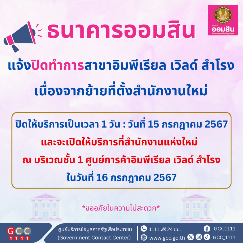 ธนาคารออมสิน แจ้งปิดให้บริการธนาคารออมสินสาขาอิมพีเรียล เวิลด์ สำโรง ในวันที่ 15 กรกฎาคม 2567