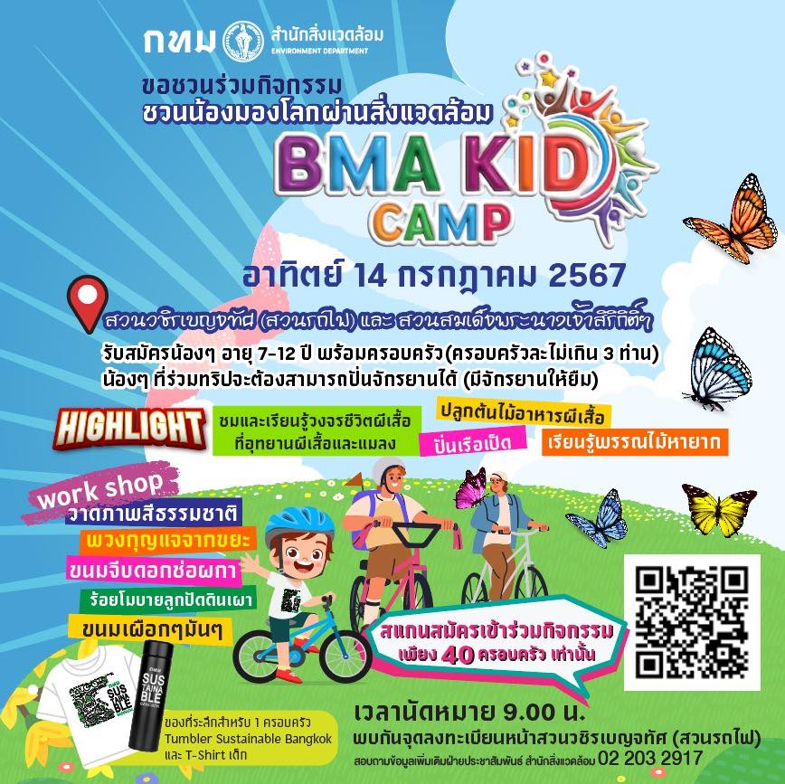 สำนักสิ่งแวดล้อม เชิญร่วมกิจกรรม”ชวนน้องมองโลกผ่านสิ่งแวดล้อม BMA Kid Camp” ในวันอาทิตย์ที่ 14 กรกฎาคม 2567 ณ สวนวชิรเบญจทัศ (สวนรถไฟ) และสวนสมเด็จพระนางเจ้าสิริกิติ์ฯ