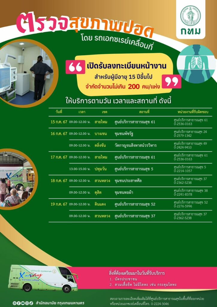 กรุงเทพมหานคร ให้บริการตรวจคัดกรองสุขภาพปอดโดยรถเอกซเรย์เคลื่อนที่ วันที่ 15 – 19 ก.ค. 67