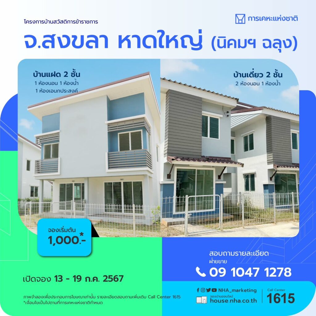 การเคหะแห่งชาติ สนับสนุนการมีบ้านของคนไทยเปิดจองโครงการบ้านสวัสดิการข้าราชการจังหวัดสงขลา หาดใหญ่ (นิคมฯ ฉลุง) บ้านเดี่ยว 2 ชั้น 2 ห้องนอน 1 ห้องน้ำ พร้อมส่วนรับแขก ส่วนรับประทานอาหาร และพื้นที่ซักล้าง และ บ้านแฝด 2 ชั้น 1 ห้องนอน 1 ห้องเอนกประสงค์ 1 ห้องน้ำ พร้อมส่วนรับแขก ส่วนรับประทานอาหาร และพื้นที่ซักล้าง