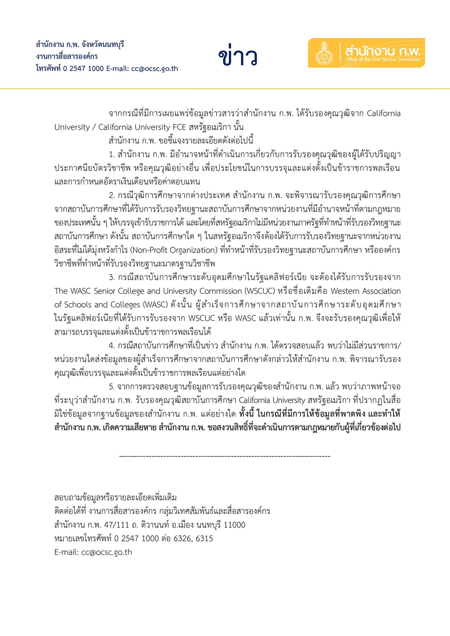 สำนักงานคณะกรรมการข้าราชการพลเรือน ชี้แจงกรณีการเผยแพร่ข้อมูลข่าวสารว่า สำนักงานคณะกรรมการข้าราชการพลเรือน ได้รับรองคุณวุฒิจาก California University / California University FCE สหรัฐอเมริกา