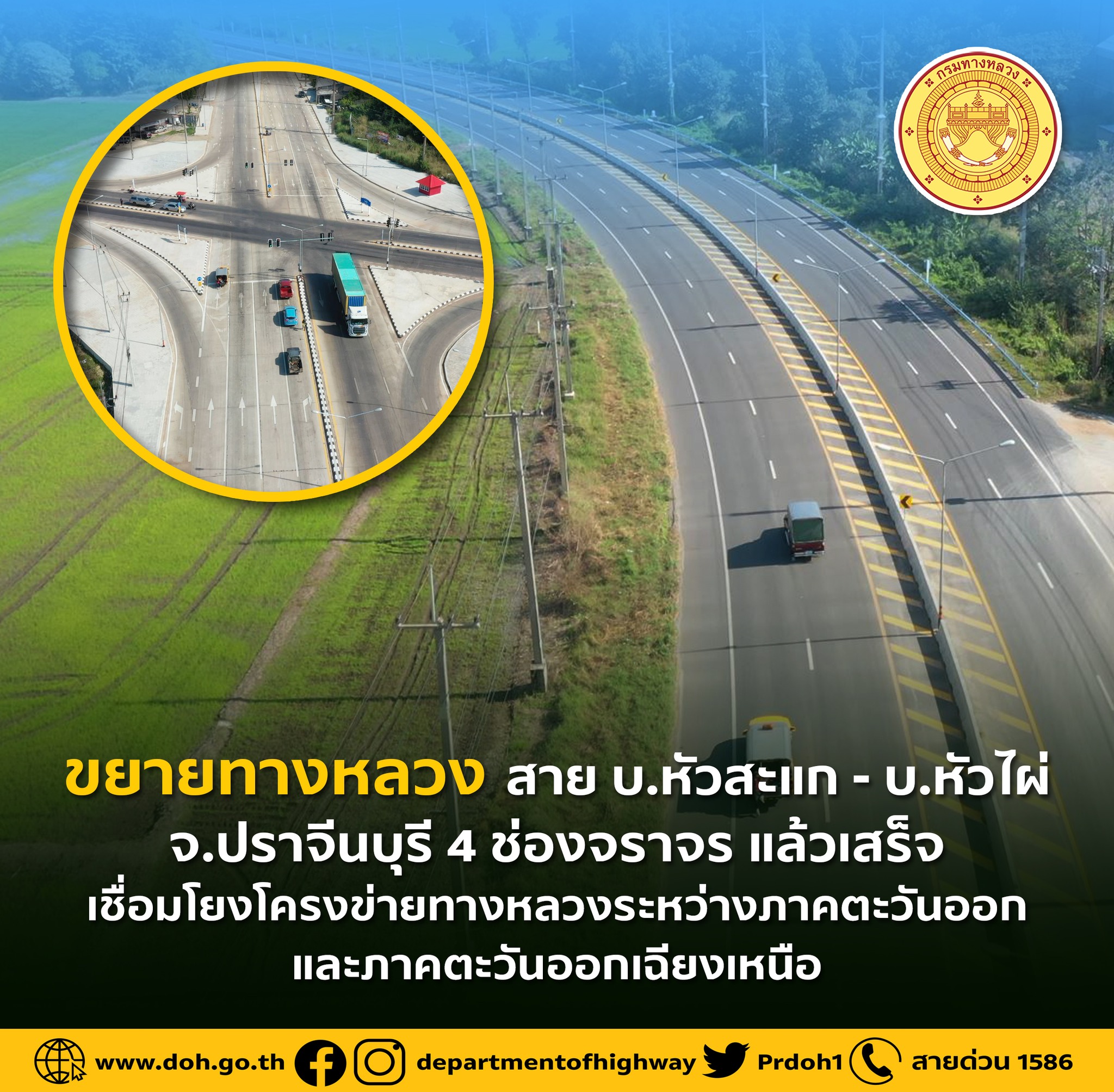 กรมทางหลวง ขยายทางหลวงหมายเลข 3481 สาย บ้านหัวสะแก – บ้านหัวไผ่ จังหวัดปราจีนบุรี แล้วเสร็จ เพิ่มประสิทธิภาพในการรองรับปริมาณจราจรที่เพิ่มสูงขึ้น และเสริมสร้างโครงข่าย การคมนาคมระหว่างภาคตะวันออกกับภาคตะวันออกเฉียงเหนือ
