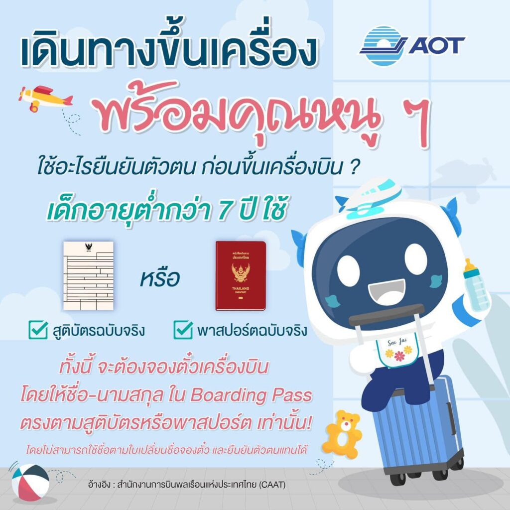 ท่าอากาศยานสุวรรณภูมิ แนะนำการยืนยันตัวตนสำหรับเด็กอายุต่ำกว่า 7 ปี ก่อนขึ้นเครื่อง ข่าวสารกิจกรรม ท่าอากาศยานสุวรรณภูมิ แนะนำการยืนยันตัวตนสำหรับเด็กอายุต่ำกว่า 7 ปี ก่อนขึ้นเครื่อง ท่าอากาศยานสุวรรณภูมิ แนะนำการยืนยันตัวตนสำหรับเด็กอายุต่ำกว่า 7 ปี ก่อนขึ้นเครื่อง ซึ่งเด็กอายุต่ำกว่า 7 ปี ต้องใช้ สูติบัตร [ฉบับจริง] หรือ พาสปอร์ต [ฉบับจริง] ทั้งนี้ จะต้องจองตั๋วเครื่องบิน โดยให้ ชื่อ – นามสกุล ใน Boarding Pass ตรงตามสูติบัตรหรือพาสปอร์ต เท่านั้น **ไม่สามารถใช้ชื่อตามใบเปลี่ยนชื่อจองตั๋ว และยืนยันตัวตนแทนได้ ** ที่มา : https://citly.me/PoEHi Post Views: 26 FacebookFacebookXTwitterLINELine