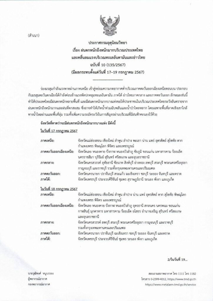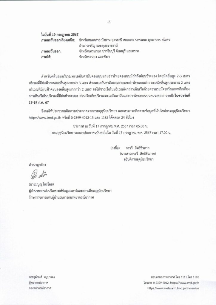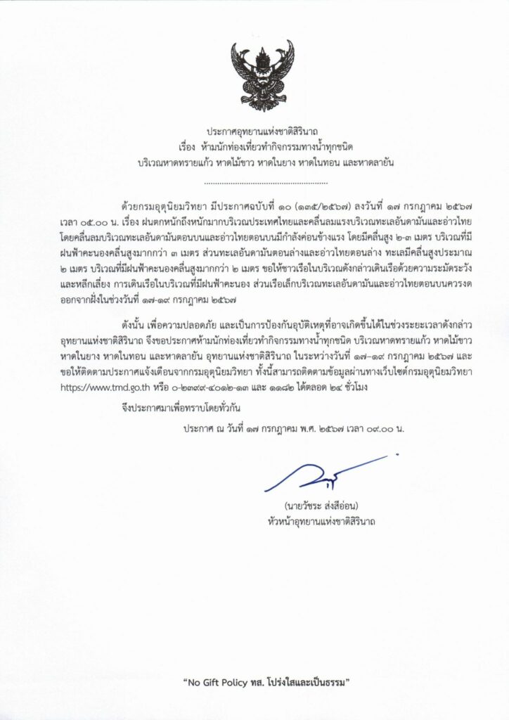 อุทยานแห่งชาติสิรินาถ ประกาศห้ามนักท่องเที่ยวทำกิจกรรมทางน้ำทุกชนิด  บริเวณหาดทรายแก้ว หาดไม้ขาว หาดในยาง หาดในทอน และหาดลายัน เนื่องจากฝนตกหนักถึงหนักมากบริเวณประเทศไทยและคลื่นลมแรงบริเวณทะเลอันดามันและอ่าวไทย ในระหว่างวันที่ 17 – 19 กรกฎาคม 2567