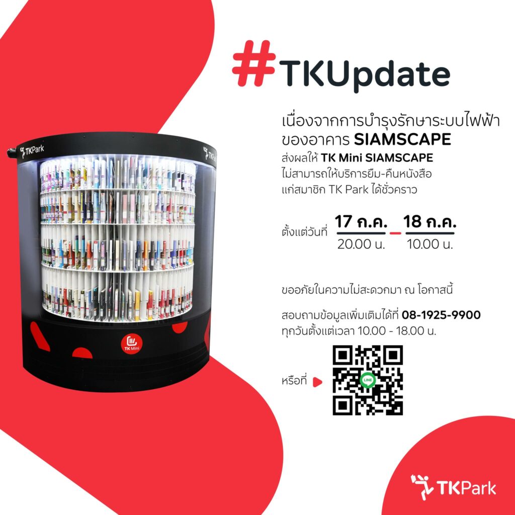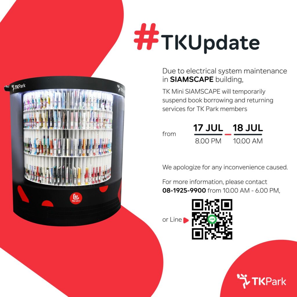 TK Park แจ้งไม่สามารถให้บริการยืม – คืนหนังสือแก่สมาชิกได้ชั่วคราว วันที่ 17 – 18 กรกฎาคม 2567