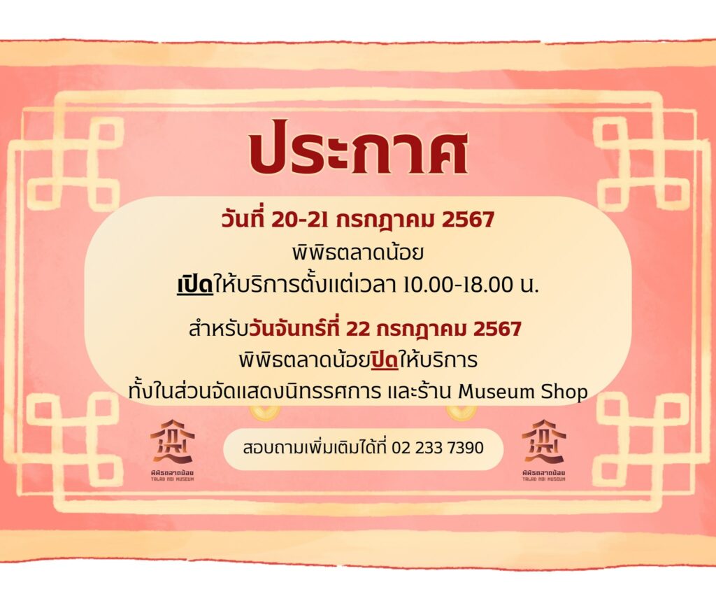 กรมธนารักษ์ แจ้งพิพิธตลาดน้อย เปิดให้บริการตามปกติ วันที่ 20 – 21 กรกฎาคม 2567 ข่าวสารกิจกรรม กรมธนารักษ์ แจ้งพิพิธตลาดน้อย เปิดให้บริการตามปกติ วันที่ 20 – 21 กรกฎาค 2567 กรมธนารักษ์ แจ้งพิพิธตลาดน้อย เปิดให้บริการตามปกติ ในวันเสาร์ที่ 20 กรกฎาคม และวันอาทิตย์ที่ 21 กรกฎาคม 2567 ตั้งแต่เวลา 10.00 – 18.00 น. สำหรับวันจันทร์ที่ 22 กรกฎาคม 2567 ปิดให้บริการทั้งในส่วนจัดแสดงนิทรรศการและ Museum Shop สามารถสอบถามรายละเอียดเพิ่มเติมได้ที่ โทร 02 233 7390 ที่มา : https://citly.me/TxKeY Post Views: 16 FacebookFacebookXTwitterLINELine