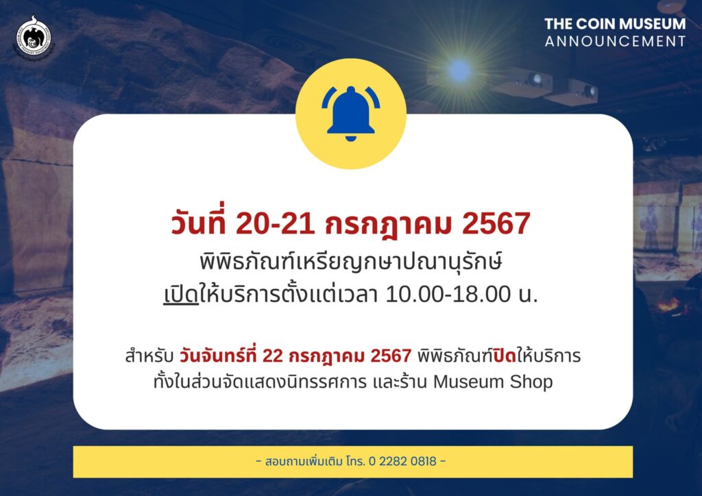 กรมธนารักษ์ แจ้งพิพิธภัณฑ์เหรียญกษาปณานุรักษ์ เปิดให้บริการตามปกติ วันที่ 20 – 21 กรกฎาคม 2567