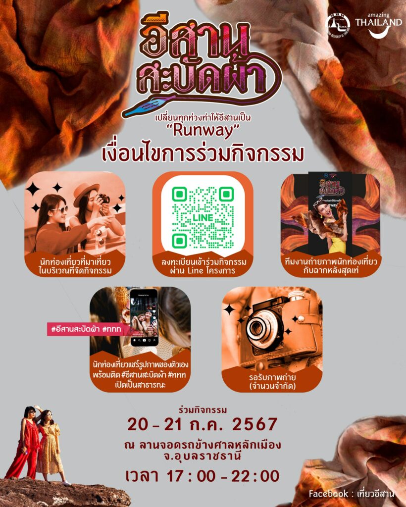 การท่องเที่ยวแห่งประเทศไทย เชิญร่วมกิจกรรมอีสานสะบัดผ้า เปลี่ยนทุกท่วงท่าให้อีสานเป็น “Runway” วันที่ 20 – 21 กรกฎาคม 2567 เวลา 17.00 – 22.00 น. ณ ลานจอดรถข้างศาลหลักเมือง จ.อุบลราชธานี