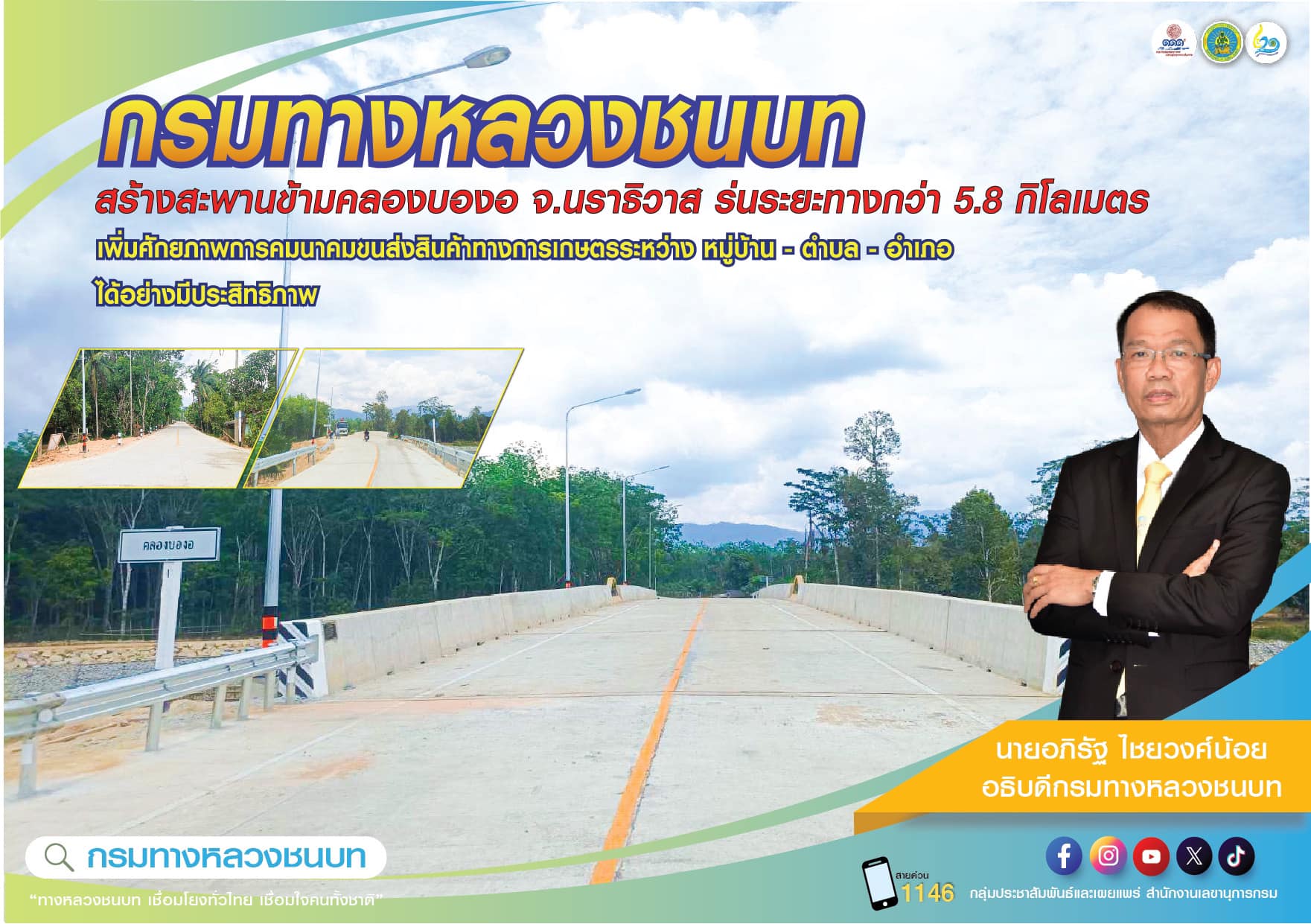 กรมทางหลวงชนบท สร้างสะพานข้ามคลองบองอ จังหวัดนราธิวาส ช่วยยกระดับคุณภาพชีวิตของประชาชนของ 2 ฟากฝั่ง ในอำเภอระแงะ จังหวัดนราธิวาส ให้สามารถเดินทางสัญจรขนส่งผลผลิตทางการเกษตร อีกทั้งยังช่วยร่นระยะทางได้มากกว่า 5.8 กิโลเมต และประหยัดค่าใช้จ่ายในการเดินทางเชื่อมโยงโครงข่ายคมนาคมการขนส่งไปสู่หมู่บ้าน ตำบล และอำเภอ ใกล้เคียงได้อย่างรวดเร็ว