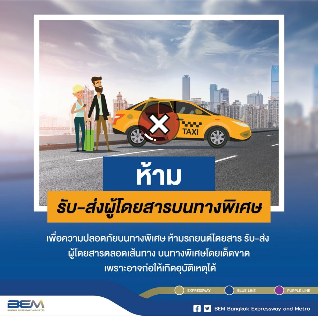 บริษัท ทางด่วนและรถไฟฟ้ากรุงเทพ จำกัด (มหาชน) แจ้ง”จอดรับส่งผู้โดยสารบนทางพิเศษ ผิดกฏหมาย ” เพื่อความปลอดภัยแก่ผู้ใช้ทาง ห้ามรับส่งผู้โดยสาร บนทางพิเศษตลอดเส้นทาง บนทางพิเศษโดยเด็ดขาด ตามพระราชบัญญัติจราจรทางบก พ.ศ. 2522 มาตรา 139 ในระเบียบเกี่ยวกับการจราจรในทางพิเศษ พ.ศ. 2524 จึงห้ามมิให้หยุดหรือจอดบนทางพิเศษ ผู้ใดฝ่าฝืนถือว่ามีความผิดตามกฎหมาย จะต้องถูกระวางโทษปรับสูงสุดไม่เกิน 1,000 บาท