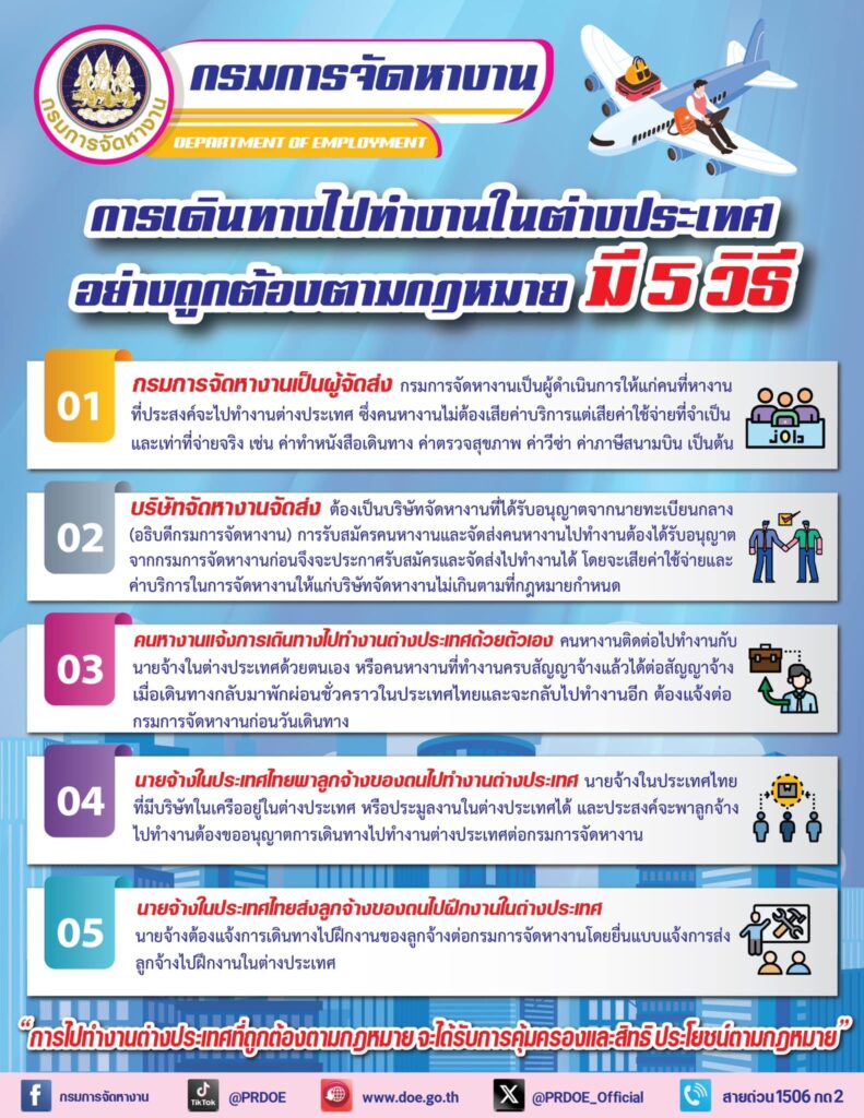 กรมการจัดหางาน แนะนำการเดินทางไปทำงานในต่างประเทศ อย่างถูกต้องตามกฎหมาย มี 5 วิธี ดังนี้