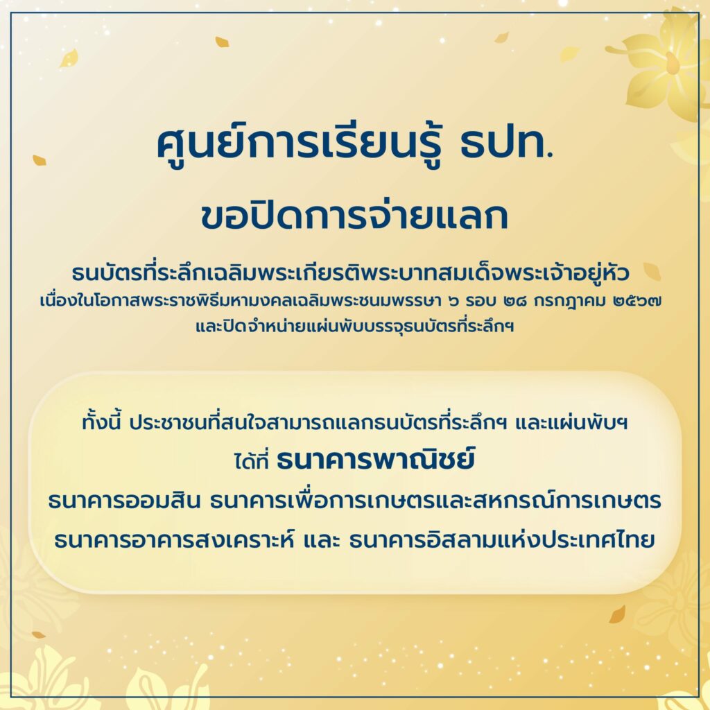 ธนาคารแห่งประเทศไทย โดย ศูนย์การเรียนรู้ ธปท. ขอปิดการจ่ายแลกธนบัตรที่ระลึกเฉลิมพระเกียรติพระบาทสมเด็จพระเจ้าอยู่หัว เนื่องในโอกาสพระราชพิธีมหามงคลเฉลิมพระชนมพรรษา 6 รอบ 28 กรกฎาคม 2567 สำหรับประชาชนที่สนใจสามารถติดต่อขอแลกธนบัตรที่ระลึกฯ และแผ่นพับฯ ได้ที่ธนาคารพาณิชย์และธนาคารของรัฐ