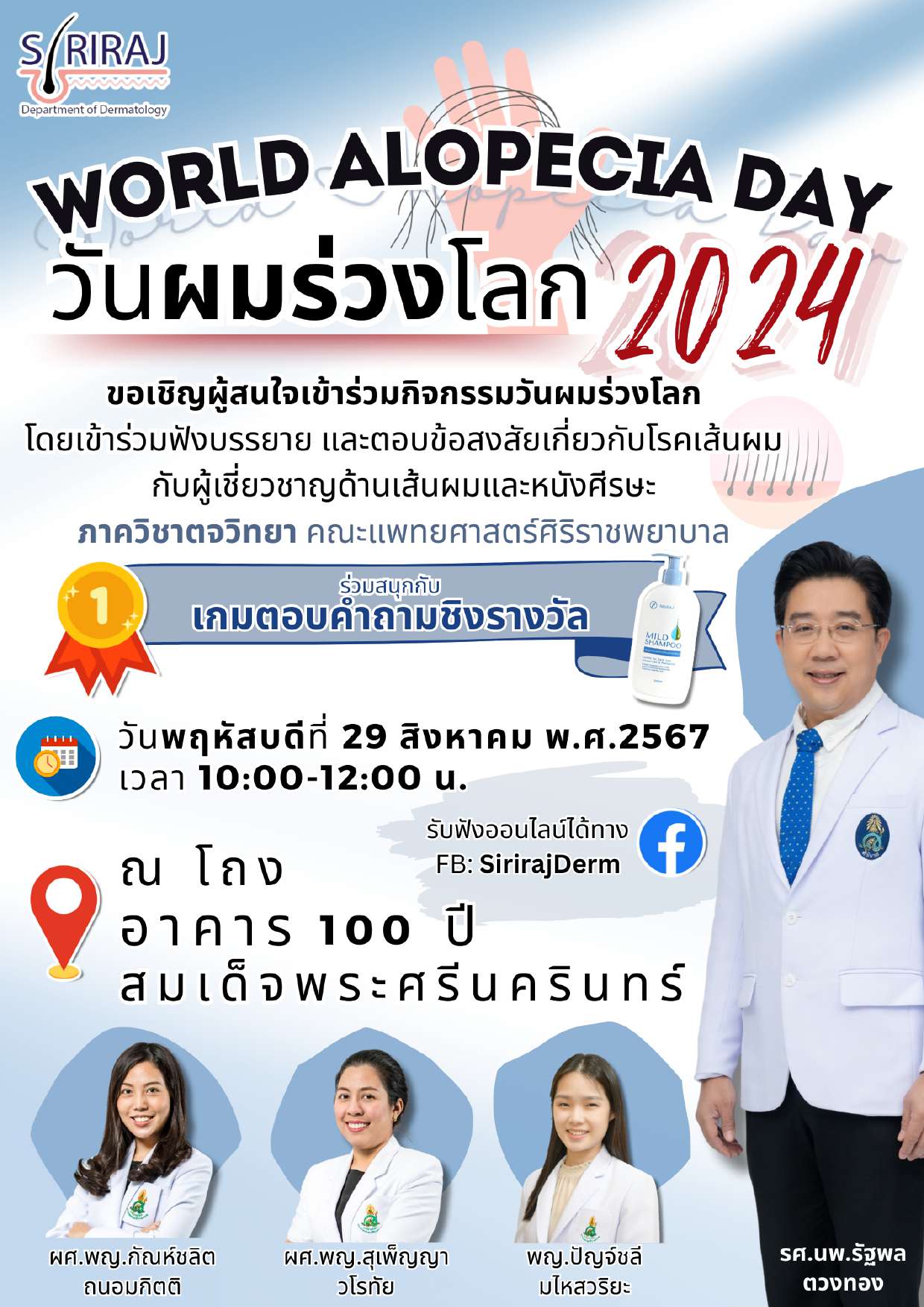 โรงพยาบาลศิริราช จัดกิจกรรมวันผมร่วงโลก ประจำปี 2567 “World Alopecia Day 2024” วันที่ 29 สิงหาคม 2567 เวลา 10.00 – 12.00 น. ณ โถงอาคาร 100 ปี อาคารสมเด็จพระศรีนครินทร์ โรงพยาบาลศิริราช ผู้ที่สนใจสามารถรับฟังทางออนไลน์ ได้ที่ Facebook : SirirajDerm
