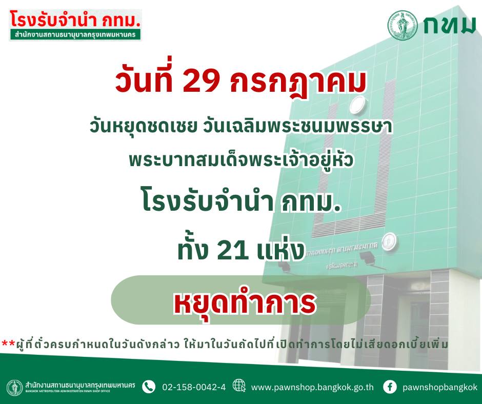 โรงรับจำนำของกรุงเทพมหานคร สถานธนานุบาลกรุงเทพมหานคร 21 แห่ง ประกาศหยุด วันที่ 29 กรกฎาคม 2567 เนื่องในวันหยุดชดเชยวันเฉลิมพระชนมพรรษา พระบาทสมเด็จพระเจ้าอยู่หัว ผู้ที่ตั๋วรับจำนำครบกำหนดส่งดอกเบี้ยหรือไถ่ถอน ตรงกับวันเสาร์ – อาทิตย์หรือวันหยุดนักขัตฤกษ์ ให้มาในวันที่เปิดทำการวันแรก โดยไม่คิดดอกเบี้ยเพิ่ม สอบถามข้อมูลเพิ่มเติมได้ที่ หมายเลขโทรศัพท์ 02-158-0042-4 เวลา 08.00 – 16.00 น. (ตามวันเวลาราชการ)