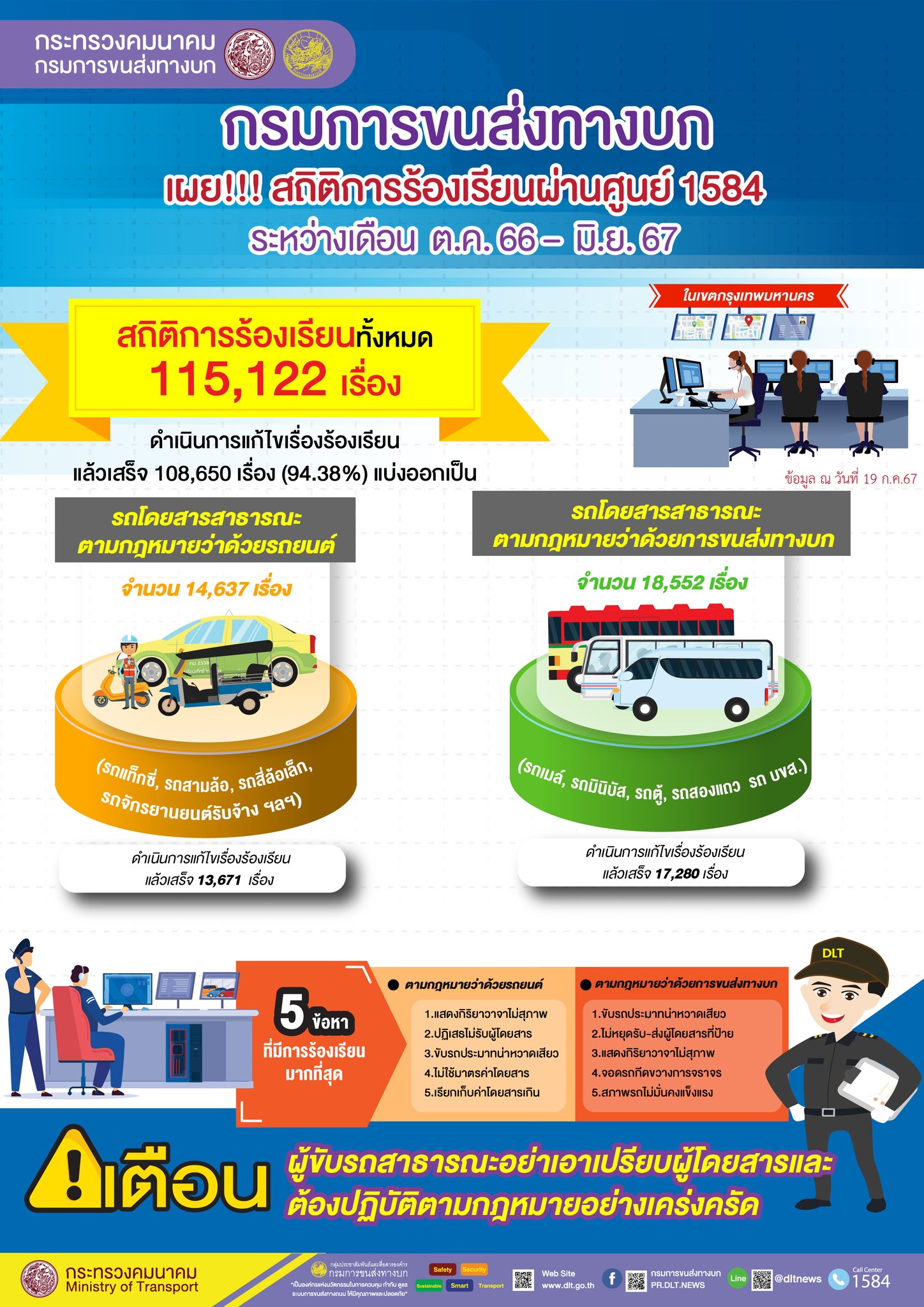 สำหรับสถิติการร้องเรียนผ่านศูนย์คุ้มครองผู้โดยสารรถสาธารณะ 1584 ประจำปีงบประมาณ 2567 ระหว่างเดือนตุลาคม 2566 – มิถุนายน 2567 จำนวนทั้งสิ้น 115,122 เรื่อง ได้ดำเนินการแก้ไขแล้วเสร็จ 108,650 เรื่อง (94.38%) แบ่งออกเป็น