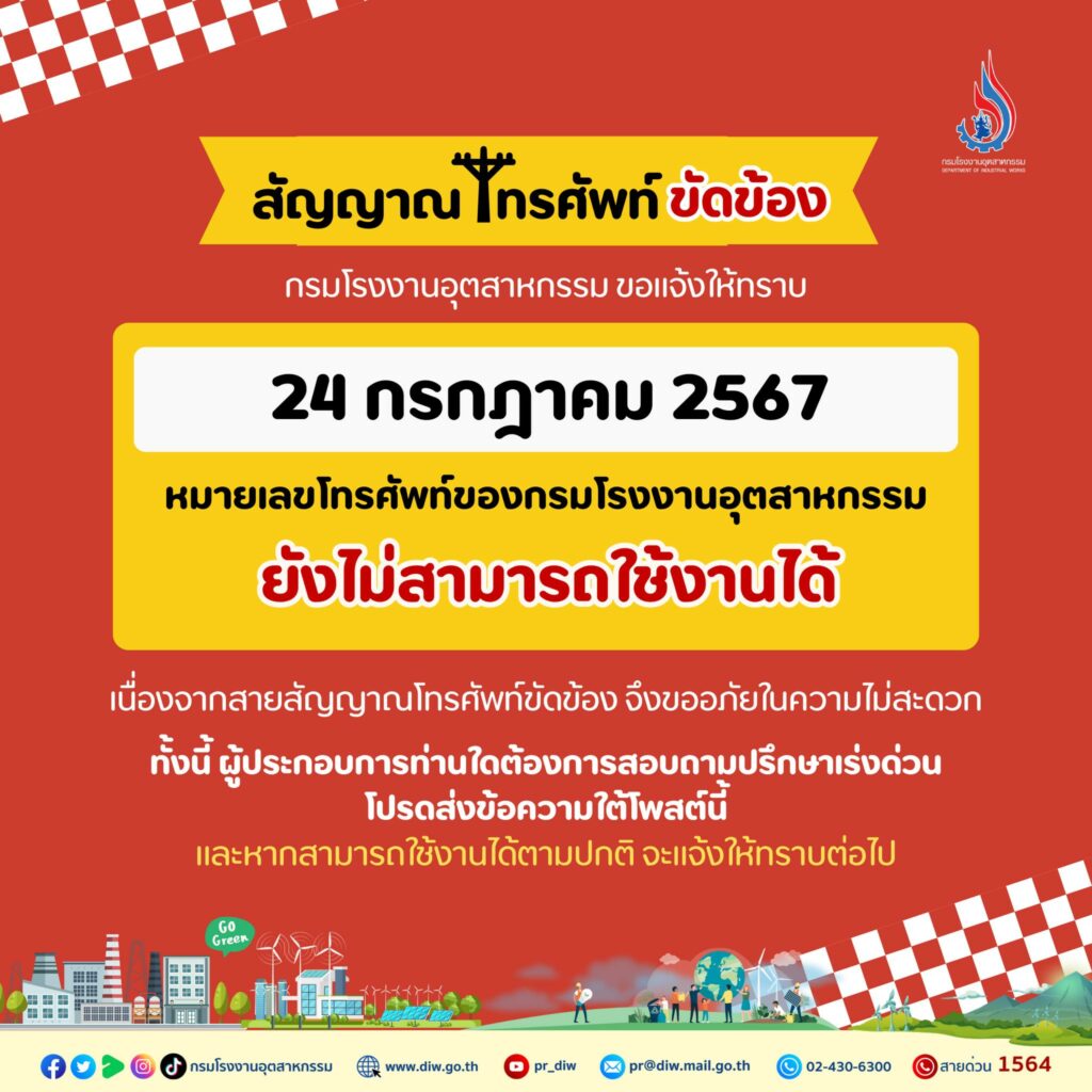 กรมโรงงานอุตสาหกรรม แจ้งขณะนี้หมายเลขโทรศัพท์กรมโรงงานอุตสาหกรรม ไม่สามารถใช้งานได้ (24 กรกฎาคม 2567)