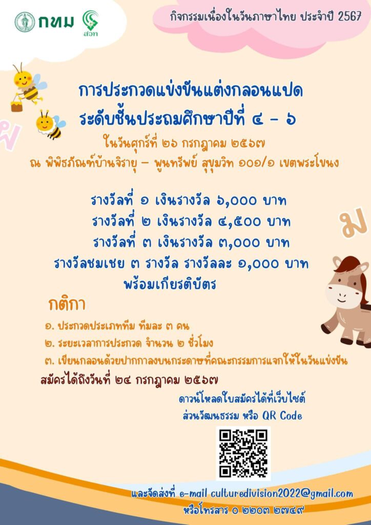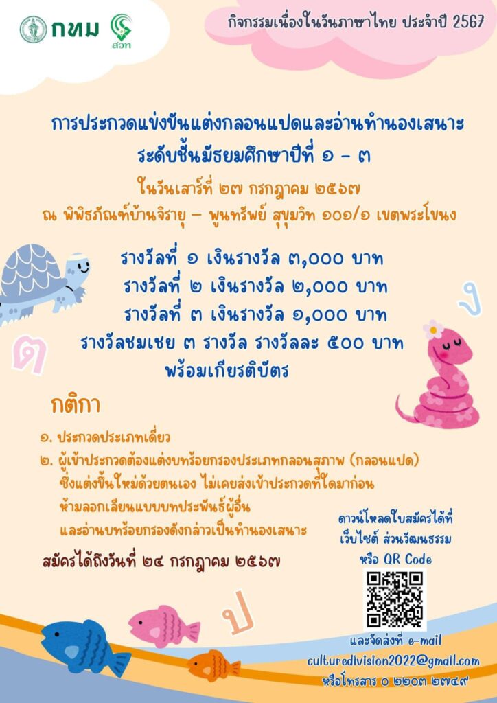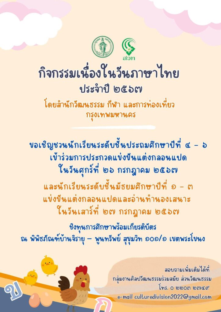กรุงเทพมหานคร เชิญน้อง ๆ นักเรียนร่วมกิจกรรมเนื่องในวันภาษาไทย ประจำปี 2567 เพื่อชิงทุนการศึกษา เกียรติบัตร และรางวัลอื่นๆ