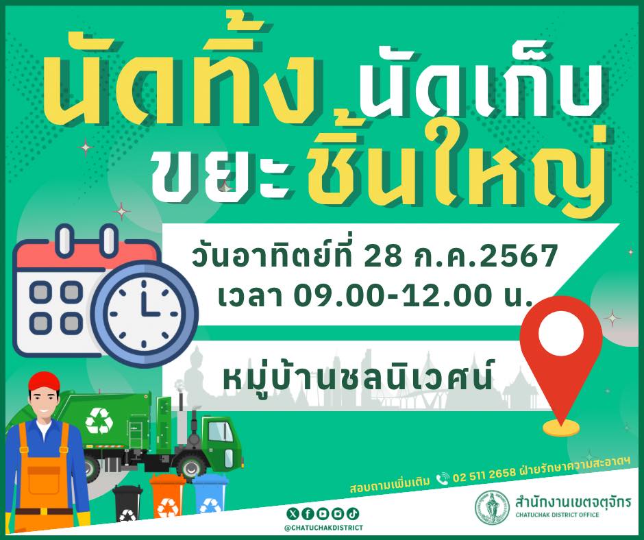 สำนักงานเขตจตุจักร นัดทิ้ง นัดเก็บ ขยะชิ้นใหญ่ วันที่ 28 กรกฎาคม 2567 ข่าวสารกิจกรรม สำนักงานเขตจตุจักร นัดทิ้ง นัดเก็บ ขยะชิ้นใหญ่ วันที่ 28 กรกฎาคม 2567 สำนักงานเขตจตุจักร นัดเวลาทิ้ง นัดเวลาเก็บ ขยะชิ้นใหญ่ วันอาทิตย์ที่ 28 กรกฎาคม 2567 เวลา 09.00 – 12.00 น. ณ หมู่บ้านชลนิเวศน์ สอบถามเพิ่มเติมที่ ฝ่ายรักษาความสะอาดและสวนสาธารณะ โทร. 0 2511 2658 ที่มา : https://citly.me/tOCwn Post Views: 129 FacebookFacebookXTwitterLINELine