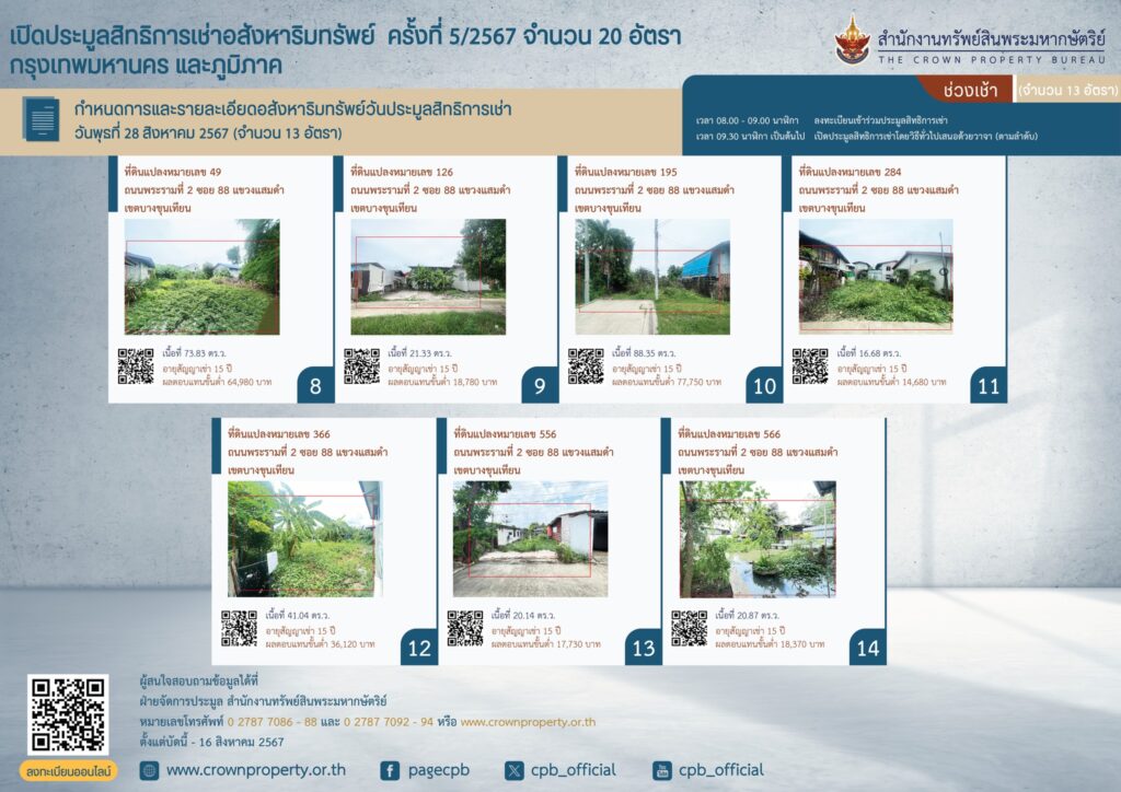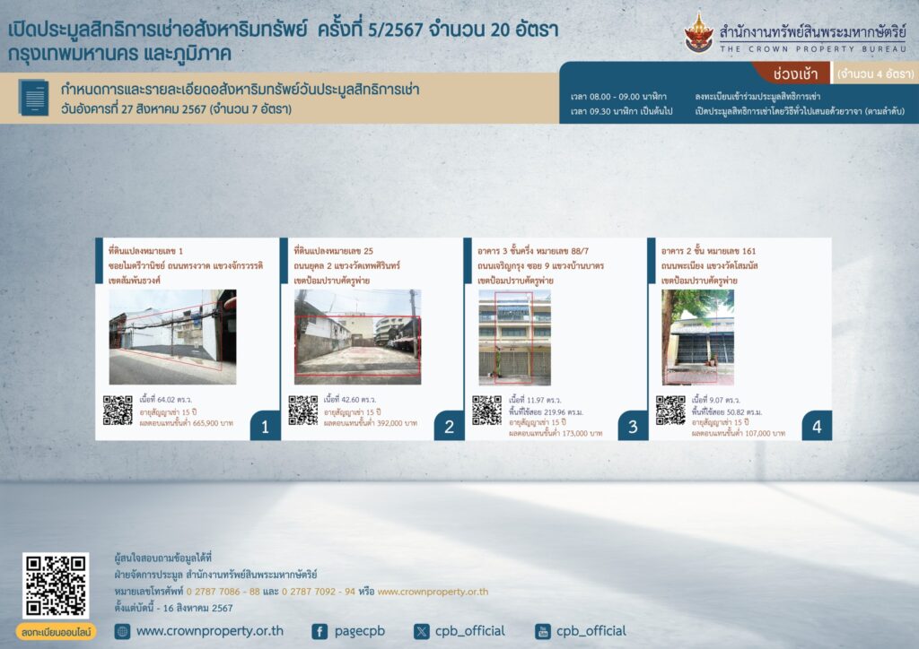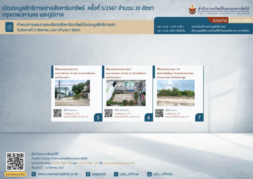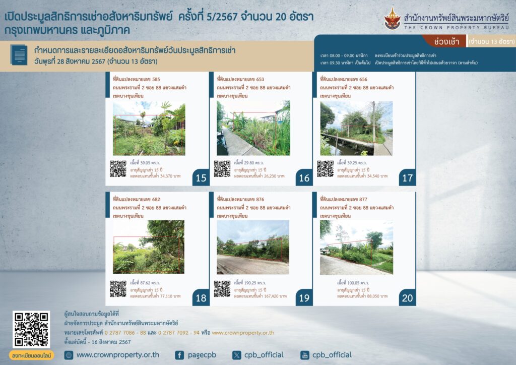 สำนักงานทรัพย์สินพระมหากษัตริย์ ข้อมูลพื้นที่เปิดประมูลสิทธิการเช่าอสังหาริมทรัพย์ 20 อัตรา กรุงเทพฯ และภูมิภาค