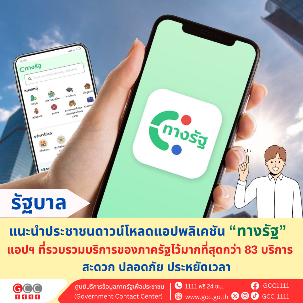รัฐบาล แนะนำประชาชนดาวน์โหลดแอปพลิเคชัน “ทางรัฐ” แอปฯ ที่รวบรวมบริการของภาครัฐไว้มากที่สุดกว่า 83 บริการ สะดวก ปลอดภัย ประหยัดเวลา