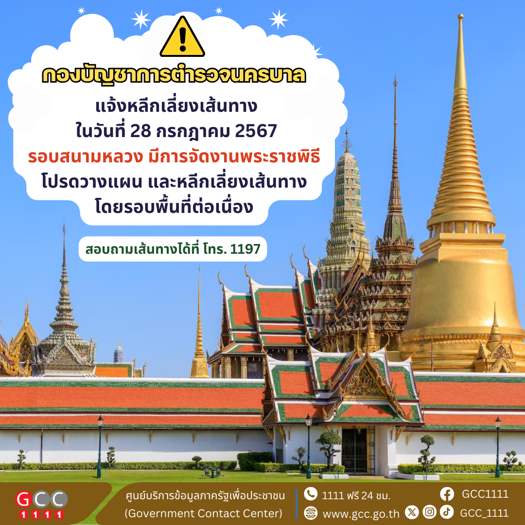 กองบัญชาการตำรวจนครบาล แจ้งหลีกเลี่ยงเส้นทางรอบสนามหลวง มีการจัดงานพระราชพิธี ในวันที่ 28 กรกฎาคม 2567 โปรดวางแผน และหลีกเลี่ยงเส้นทางบริเวณโดยรอบพื้นที่ต่อเนื่อง สอบถามข้อมูลเส้นทางได้ที่ สายด่วนจราจร 1197
