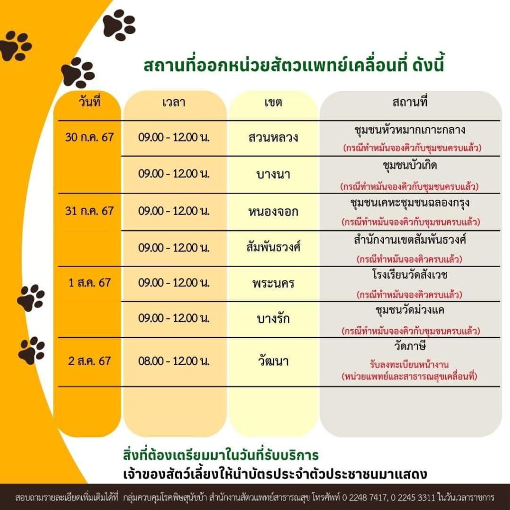 สำนักอนามัย กรุงเทพมหานคร ออกหน่วยสัตวแพทย์เคลื่อนที่ วันที่ 30 กรกฏาคม – 2 สิงหาคม 2567