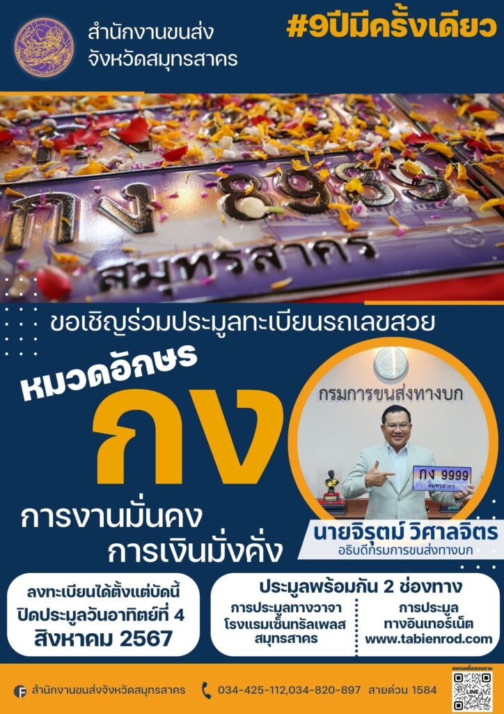 สำนักงานขนส่งจังหวัดสมุทรสาคร จัดงานประมูลทะเบียนรถเลขสวย หมวดอักษร กง ในวันอาทิตย์ที่ 4 สิงหาคม 2567 ประมูลพร้อมกัน 2 ช่องทาง วาจา และ Internet