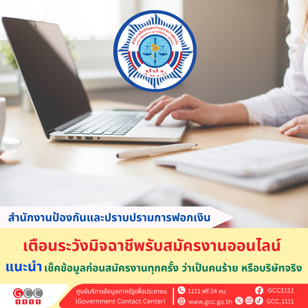 สำนักงานป้องกันและปราบปรามการฟอกเงิน เตือนระวังมิจฉาชีพรับสมัครงานออนไลน์ แนะนำเช็คข้อมูลก่อนสมัครงานออนไลน์ทุกครั้ง ว่าเป็นคนร้าย หรือบริษัทจริง