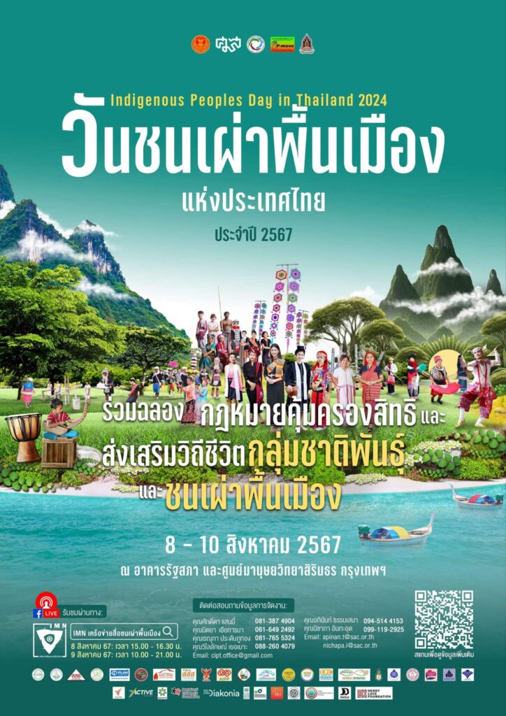 ศูนย์มานุษยวิทยาสิรินธร (องค์การมหาชน) (ศมส.) ร่วมกับสภาชนเผ่าพื้นเมืองและภาคีเครือข่ายขอเชิญร่วมงานวันชนเผ่าพื้นเมืองแห่งประเทศไทย ปี 2567 และ “ร่วมฉลองกฎหมายคุ้มครองสิทธิและส่งเสริมวิถีชีวิต กลุ่มชาติพันธุ์และชนเผ่าพื้นเมือง” วันที่ 8 – 10 สิงหาคม 2567 ณ อาคารรัฐสภา และศูนย์มานุษยวิทยาสิรินธร กรุงเทพฯ
