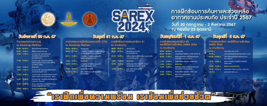 กองทัพอากาศไทย จัดการฝึกซ้อมการค้นหาและช่วยเหลืออากาศยานประสบภัย ประจําปี 2567 (SAREX 2024) เพื่อเตรียมการและบูรณาการด้านการค้นหาและช่วยเหลือเมื่อมีอากาศยานประสบภัยให้เป็นไปตามพระราชบัญญัติการเดินอากาศ (ฉบับที่ 14) พ.ศ.2562 มาตรฐานและข้อพึงปฏิบัติขององค์การการบินพลเรือนระหว่างประเทศ และสํานักงานการบินพลเรือนแห่งประเทศไทย ภายใต้ “เราฝึกเพื่อความพร้อม เราซ้อมเพื่อช่วยชีวิต” วันที่ 30 กรกฎาคม – 2 สิงหาคม 2567 ณ กองบิน 23 จังหวัดอุดรธานี