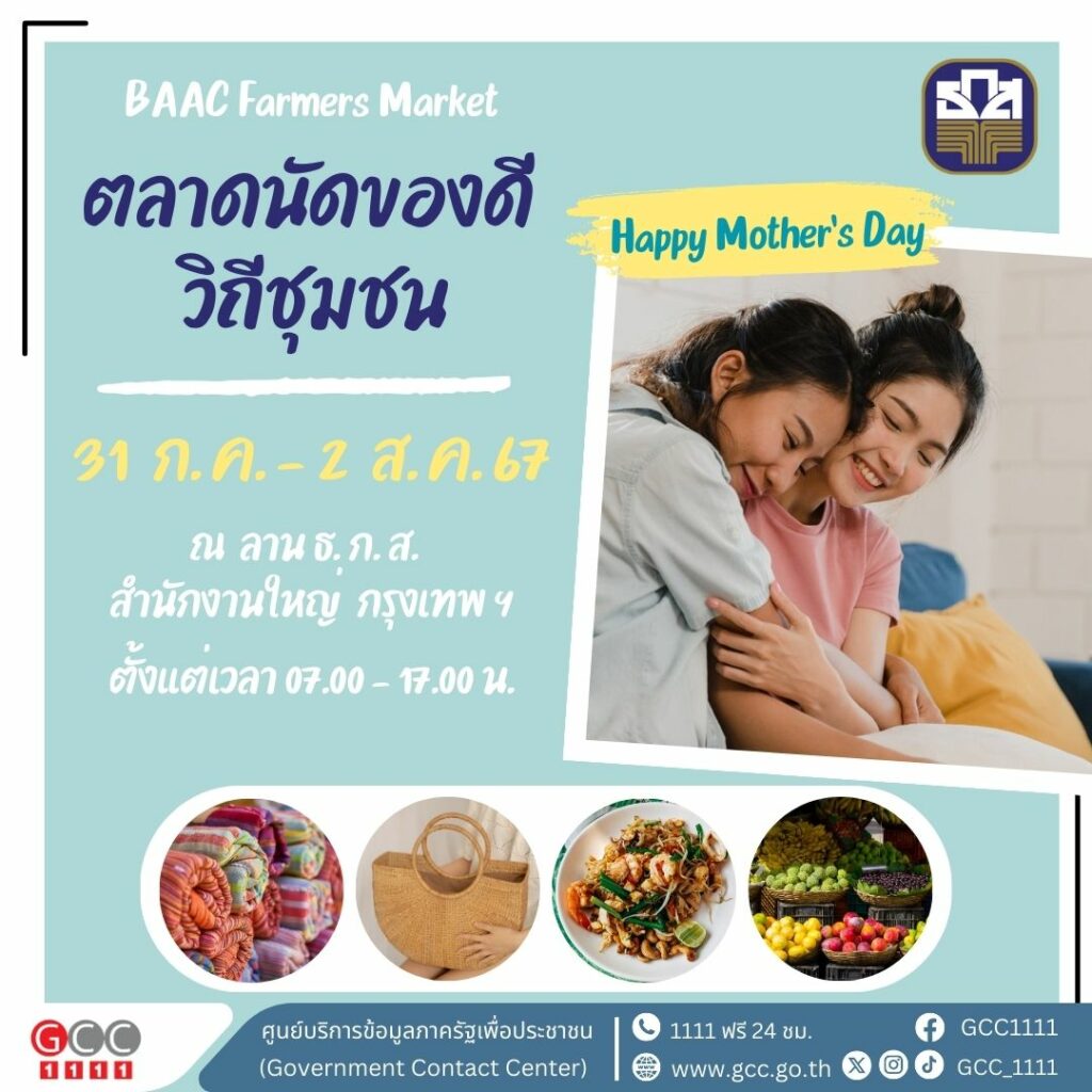 ธนาคารเพื่อการเกษตรและสหกรณ์การเกษตร เชิญร่วมงาน BAAC Farmers Market ตลาดนัดของดี วิถีชุมชน ภายใต้ธีม “Happy Mother’s Day” ต้อนรับเทศกาลวันแม่ประจำปี 2567 ระหว่างวันที่ 31 กรกฎาคม – 2 สิงหาคม 2567 ณ บริเวณด้านหน้า ธ.ก.ส. สำนักงานใหญ่ กรุงเทพมหานคร ตั้งแต่เวลา 07.00 – 17.00 น. โดยรวบรวมสินค้าเกษตร ผักผลไม้อินทรีย์นานาชนิด ผลิตภัณฑ์แปรรูป และผลิตภัณฑ์ผ้าพื้นถิ่นของแต่ละภาคที่มีคุณภาพได้มาตรฐานจากเกษตรกรโดยตรงกว่า 50 ร้านค้า เพื่อเป็นของขวัญสุดพิเศษต้อนรับวันแม่