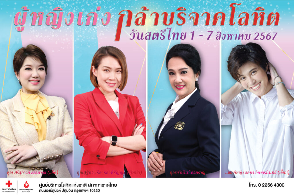 ศูนย์บริการโลหิตแห่งชาติ สภากาชาดไทย เชิญชวนหญิงไทยร่วมบริจาคโลหิต เพื่อช่วยต่อลมหายใจให้กับผู้ป่วย เนื่องในวันสตรีไทย