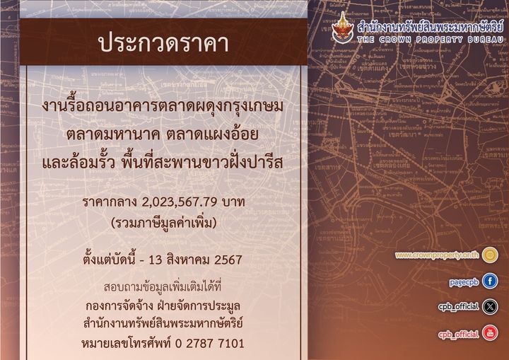 สำนักงานทรัพย์สินพระมหากษัตริย์ เปิดประกวดราคางานรื้อถอนอาคารตลาดผดุงกรุงเกษม ตลาดมหานาค ตลาดแผงอ้อย และล้อมรั้ว พื้นที่สะพานขาวฝั่งปารีส สอบถามข้อมูลเพิ่มเติมได้ที่ กองการจัดจ้าง ฝ่ายจัดการประมูล สำนักงานทรัพย์สินพระมหากษัตริย์ หมายเลขโทรศัพท์ 0 2787 7101 ระหว่างเวลา 08.30 – 16.30 น. (ในวันและเวลาทำการ) ตั้งแต่บัดนี้ – 13 สิงหาคม 2567 ดูรายละเอียดเพิ่มเติมได้ที่ https://bit.ly/4d2KNaD