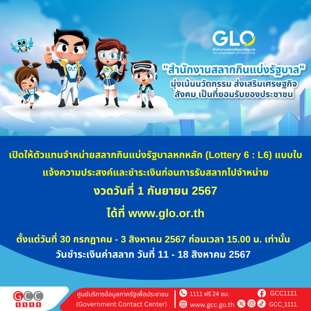 สำนักงานสลากกินแบ่งรัฐบาล เปิดให้ตัวแทนจำหน่ายสลากกินแบ่งรัฐบาลหกหลัก (Lottery 6: L6) แบบใบ แจ้งความประสงค์ งวดวันที่ 1 กันยายน 2567