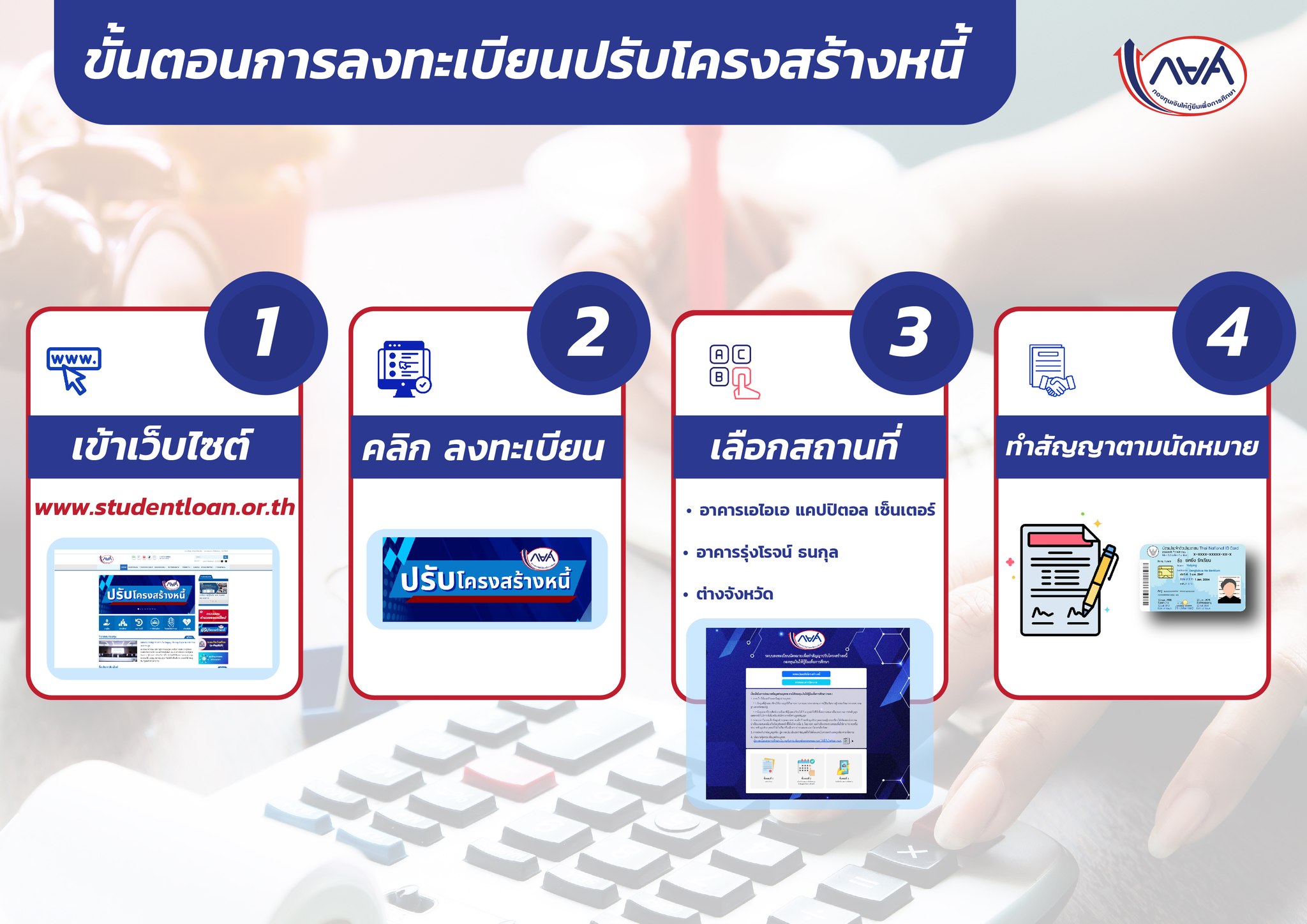 กองทุนเงินให้กู้ยืมเพื่อการศึกษา แนะนำ ขั้นตอนการลงทะเบียนปรับโครงสร้างหนี้ ข่าวสารกิจกรรม กองทุนเงินให้กู้ยืมเพื่อการศึกษา แนะนำ ขั้นตอนการลงทะเบียนปรับโครงสร้างหนี้ กองทุนเงินให้กู้ยืมเพื่อการศึกษา แนะนำ ขั้นตอนการลงทะเบียนปรับโครงสร้างหนี้ ขั้นตอนการลงทะเบียนปรับโครงสร้างหนี้เข้าเว็บไซต์ www.studentloan.or.thคลิก ลงทะเบียน ที่ Banner ปรับโครงสร้างหนี้เลือกสถานที่ อาคารเอไอเอ แคปปิตอล เซ็นเตอร์อาคารรุ่งโรจน์ ธนกุลต่างจังหวัดทำสัญญาตามนัดหมาย ขั้นตอน ณ วันทำสัญญาปรับโครงสร้างหนี้ผู้กู้ยืมเงินยื่นบัตรประจำตัวประชาชนเจ้าหน้าที่ชี้แจงสัญญายอดชำระรายเดือนลงนามในสัญญาเสร็จสิ้นการทำสัญญา ที่มา : https://shorturl.asia/HNrWi Post Views: 102 FacebookFacebookXTwitterLINELine